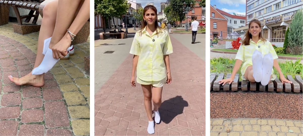 В конце видео девушка садится на лавочку и демонстрирует перед камерой свои почти чистые белые носки.