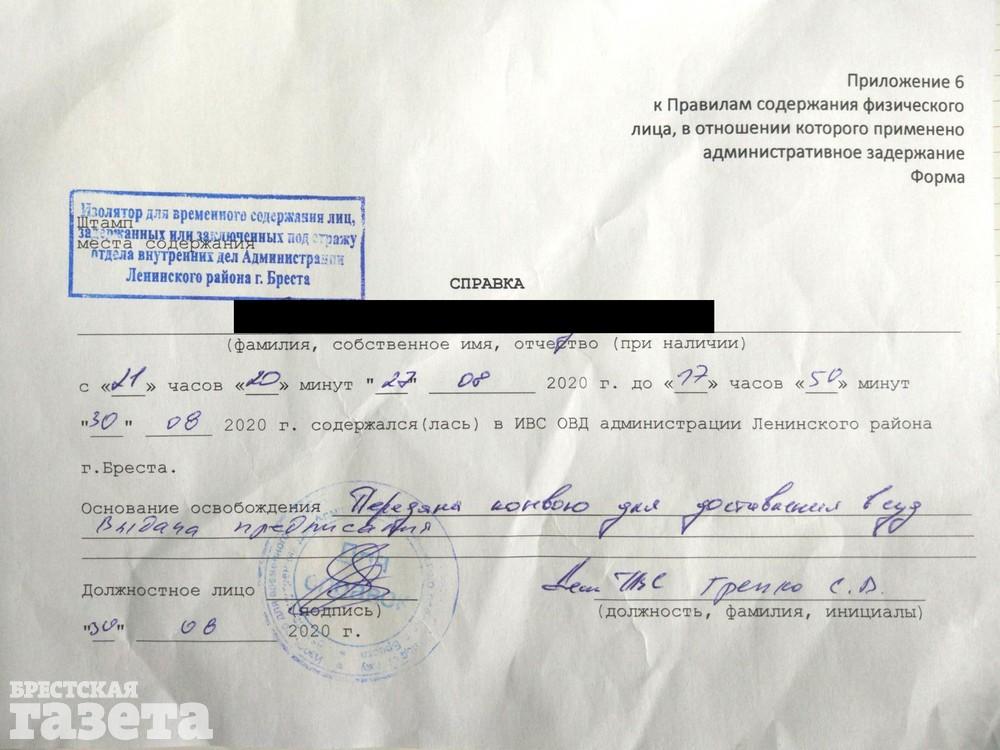 На свободу брестчанки вышли только вечером 30 августа. Перед тем как выпустить из ИВС, их снова досмотрели, а на выходе дали справку об освобождении.