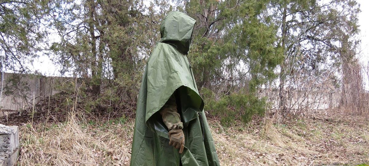 «Влагозащитный плащ-пончо с капюшоном, по бокам фиксируется липучкой-лентой или кнопками, размер универсальный, цвет — военный мох, с внутренней стороны ткань обработана пропитками из полиуретана (РИ) или поливинилхлорида (РУС). В комплекте чехол для переноски».
