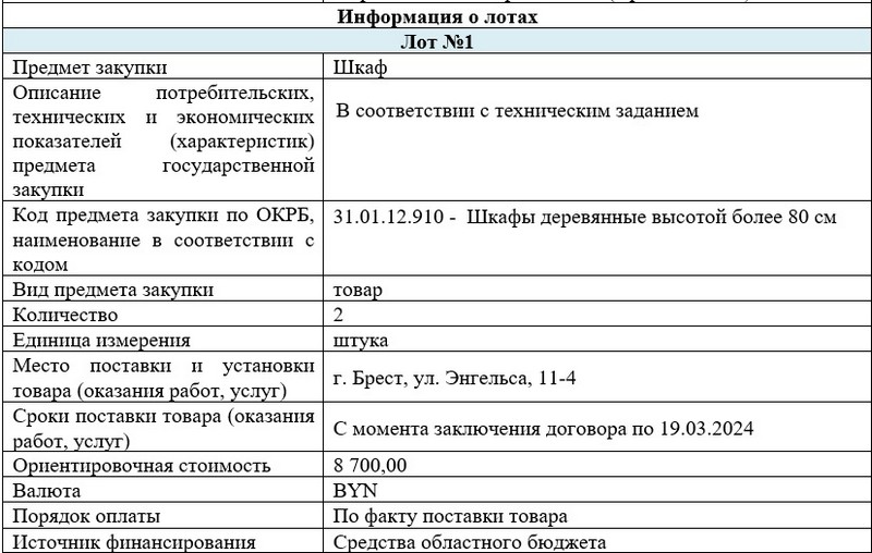 Во вторник, 12 марта, Брестский облисполком купил в квартиру №4 дома на улице Энгельса, 11 два шкафа (гардеробный и купе) за 8 700 рублей. Их поставят в эту квартиру до 19 марта.