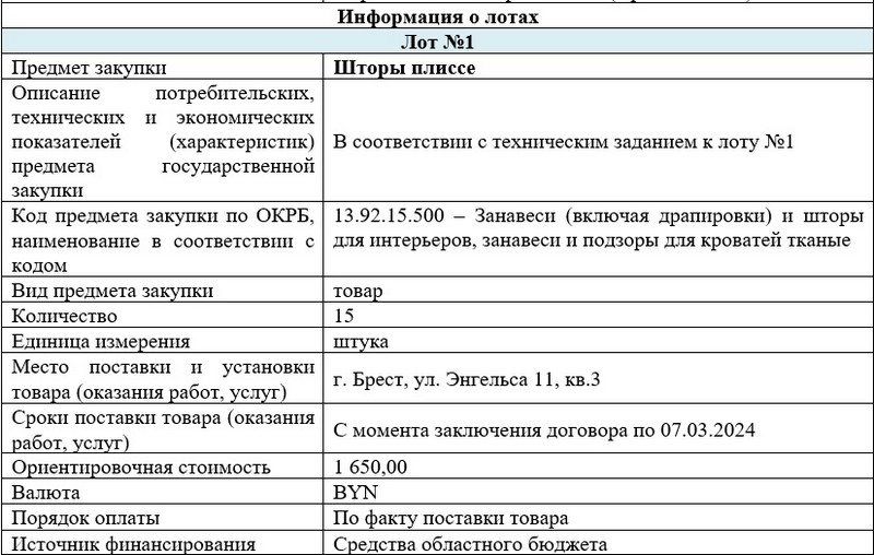 К 7 марта в квартиру №3 дома на улице Энгельса, 11 Брестский облисполком закупил шторы плиссе. Это разновидность горизонтальных жалюзи, которые состоят из профиля с двух сторон и гофрированной ткани, собранной гармошкой между ним, ширина складок обычно составляет 20 миллиметров. На 15 таких штор плиссе из областного бюджета потратили 1 650 рублей, то есть одна стоила примерно 110 рублей.