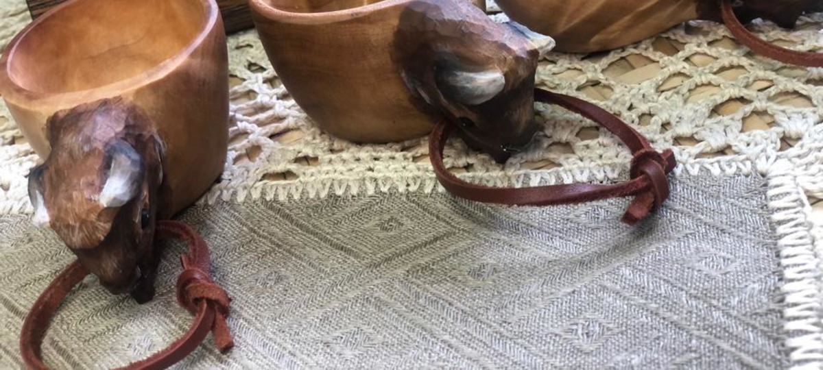 «Набор килишек в подарочной деревянной шкатулке на 6 персон. Изготовление килишек из березового капа с использованием ручной резьбы по дереву, изготовление подарочной упаковки из дуба. Шкатулка прямоугольной формы с рисунком «Зубры». Килишки с ручкой в форме «головы зубра» с кожаной веревочкой. Размеры: ширина шкатулки — 14 см, длина — 30 см, высота — 5,5 см, диаметр килишек — 5 см. Количество: 10 наборов».