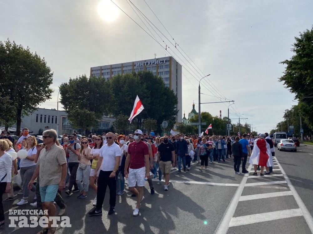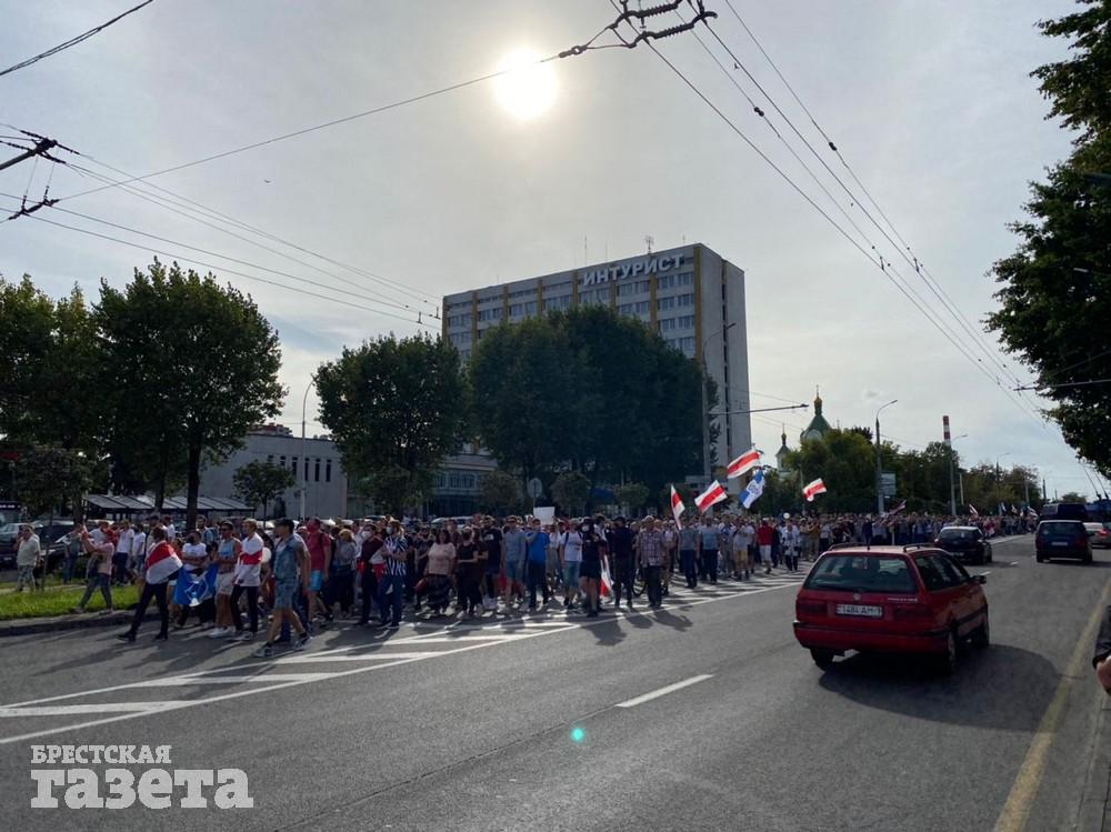 15.17. Колонна, которая шла по Пушкинской возле рынка, повернула на Карбышева. Перед каждым перекрестком люди притормаживают, опасаясь задержаний.