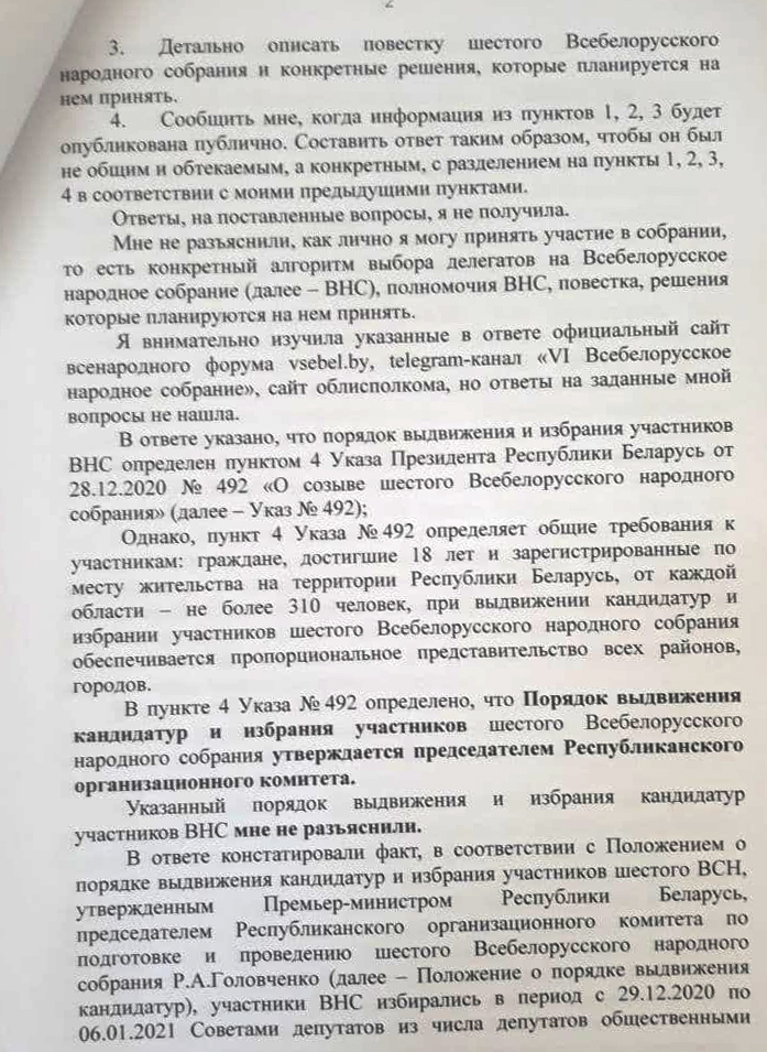 Анна Баран долго обосновывала свою позицию, почему считает ответ облисполкома отпиской, в которой нет ответа на вопросы. В частности, она обратила внимание суда, что не нашла в общем доступе в Сети четкой информации о порядке выдвижения и избрания участников шестого ВНС, хотя потратила на это достаточно много времени.