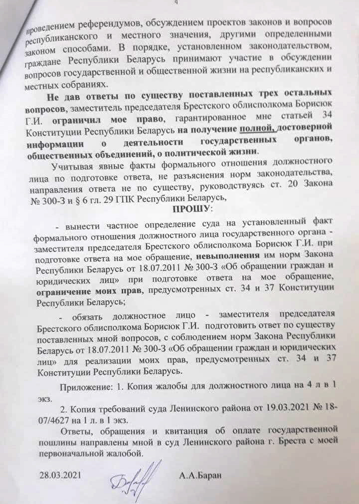 В жалобе Анна Баран просила «вынести частное определение суда на установленный факт формального отношения должностного лица государственного органа», невыполнение им норм Закона Республики Беларусь от 18.07.2011 №300-3 «Об обращении граждан и юридических лиц» при подготовке ответа на обращение, ограничение ее прав, предусмотренных статьями 34 и 37 Конституции РБ, и обязать Геннадия Борисюка подготовить ответ на поставленные ею вопросы по существу.