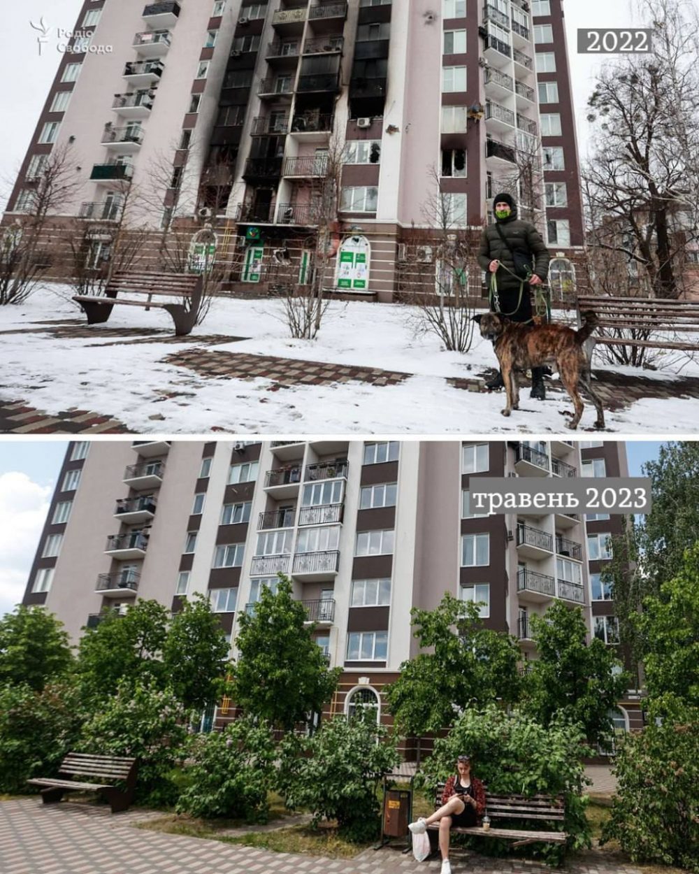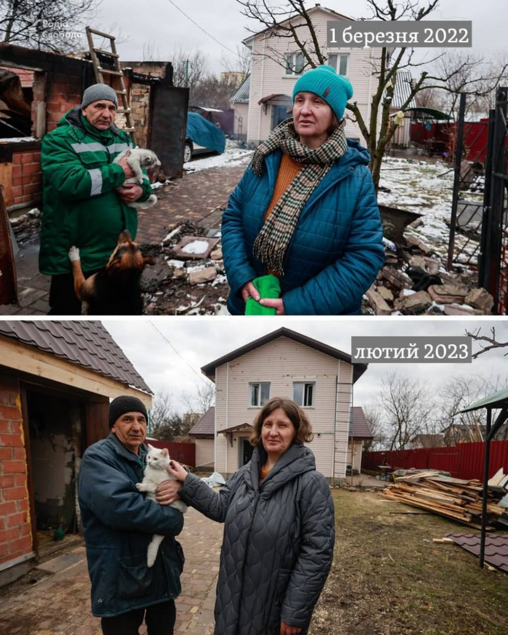 За год Вокзальную не узнать – американская некоммерческая организация Global Empowerment Mission (GEM) совместно с партнерами и властями отремонтировали 110 домов. Около 20 из них требовали более значительных ремонтных работ. Практически повсюду пришлось восстанавливать окна и крыши. И самое главное – 12 полностью разрушенных домов были отстроены с нуля.Улица Вокзальная и сожженная техника русской армии, город Буча, Киевская область, 1 марта 2022 года. То же место – май 2023 года.Кроме того, в результате активных боевых действий российские войска разрушили и большинство инфраструктуры: электроопоры, коммуникации, дорожное покрытие – все это также отстроили благотворители совместно с городскими властями.Местные жители Наталья и Рустем: «Дом цел, но то, что кирпичик к кирпичику сам выкладывал, сам составлял, – на старости лет решили, чтобы жить легче было. Видите, как произошло – теперь начинать сначала? Очень тяжело, очень страшно было сидеть в подвале, как все грохотало. Думали, у нас самая безопасная зона. А видите, как вышло». Город Буча, Киевская область, 1 марта 2022 года.