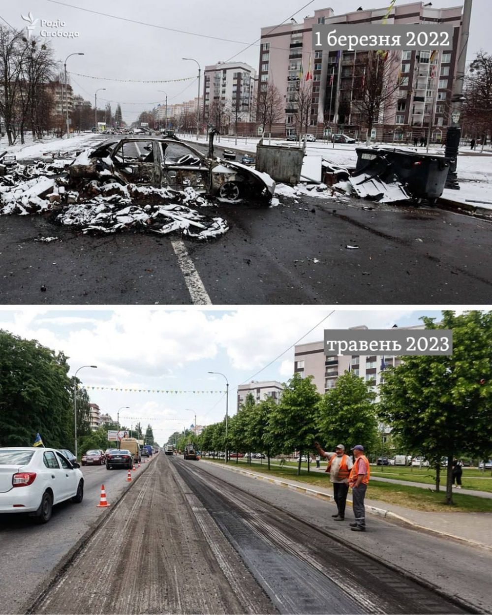 Одна из центральных улиц города 1 марта 2022 и новое шоссе в мае 2023 года (снизу).По официальным данным, более 2,5 тысяч сооружений повредили российские оккупанты в Буче. В общей сложности ущерб города составляет более 5 миллиардов гривен. В сентябре прошлого года городской голова Анатолий Федорук сообщал, что в городе снесут 372 частных дома и два многоэтажных. Они не подлежат восстановлению.1 марта 2022 года. Буча, улица Вокзальная. Именно по ней тридцатикилометровая колонна российской техники шла через весь город в Ирпень, а оттуда планировала идти в Киев, чтобы взять его за 3 дня. Снизу улица Вокзальная в Буче в мае 2023 года.Тогда этой колонне помешали добровольцы из Бучи, впоследствии ее уничтожили Вооруженные силы Украины.