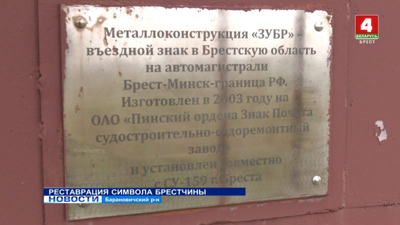 Гигантский зубр стоит на 250-м км трассы М1 на въезде в Брестскую область почти 20 лет. Скульптуру изготовили в 2003 году на Пинском судостроительно-судоремонтном заводе. Высота — 30 м, вес — 70 т. ТРК «Брест» называет другие цифры: высота — порядка 25 метров, длина — 27 метров, вес — около 60 тонн.