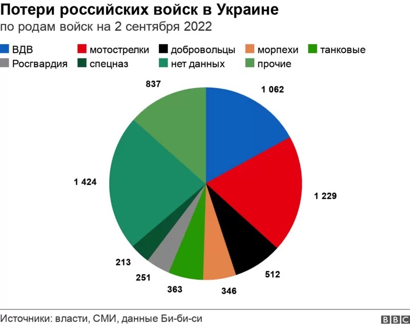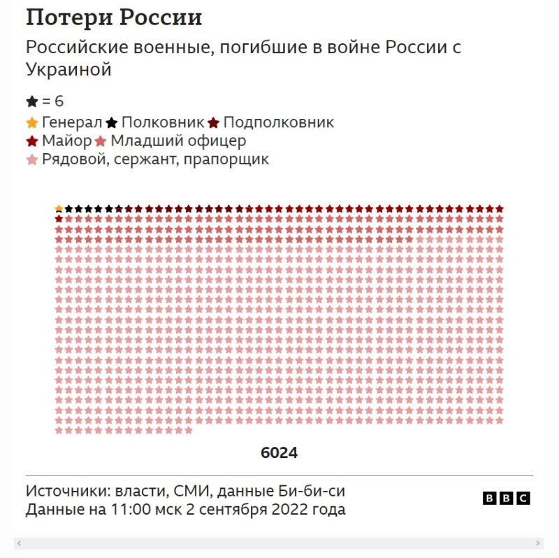 Русская служба Би-би-си ведет поименный список потерь российских военнослужащих в Украине совместно с изданием «Медиазона» (признано в России «СМИ-иноагентом») и командой волонтеров. На 2 сентября Би-би-си удалось подтвердить информацию о 6 024 погибших солдатах и офицерах.