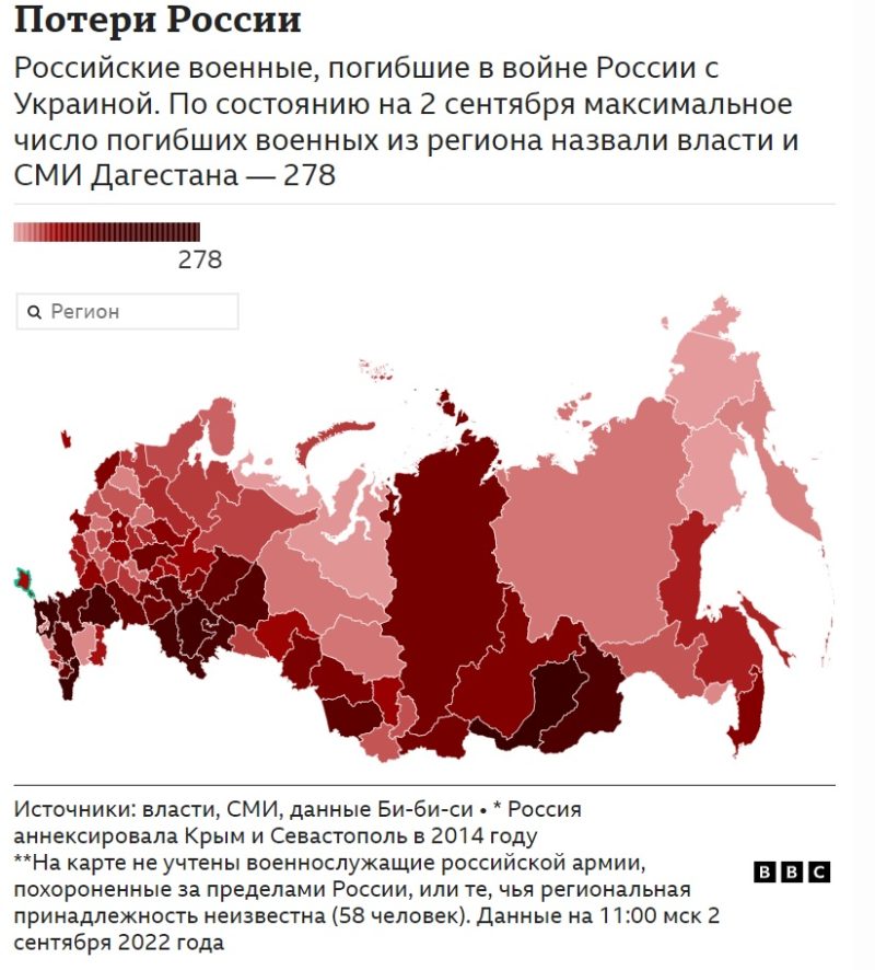 По числу потерь в российских регионах по-прежнему лидируют Дагестан (278 человек), Бурятия (256 человека) и Краснодарский край (227 человек). Для сравнения: известно лишь об 15 погибших из Москвы, хотя жители столицы составляют почти 9% населения России.