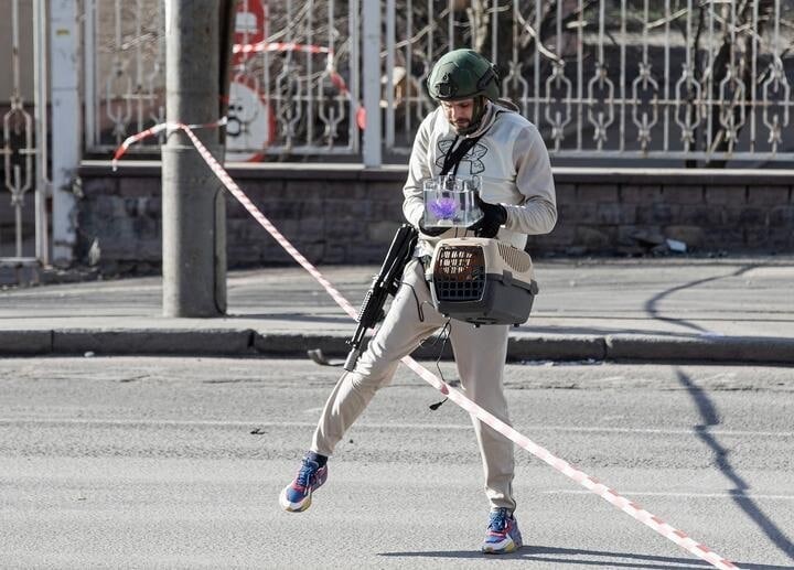 В первые дни войны одним из самых популярных стало фото, где житель Киева несет кошку в переноске и рыбку в аквариуме, которых он вынес из жилого дома на Лобановского, 6а, пострадавшего от обстрела. На бедре у него — ружье, похожее на страйкбольное, а на голове — каска.