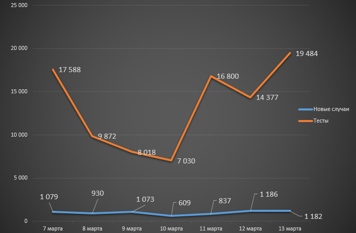 В целом отметим, что количество выполненных тестов изменилось и составило 93 169 (на предыдущей неделе – 110 548), а официальная смертность снизилась на 5: неделей ранее было 63 летальных исхода, с 6 по 13 марта – 58.