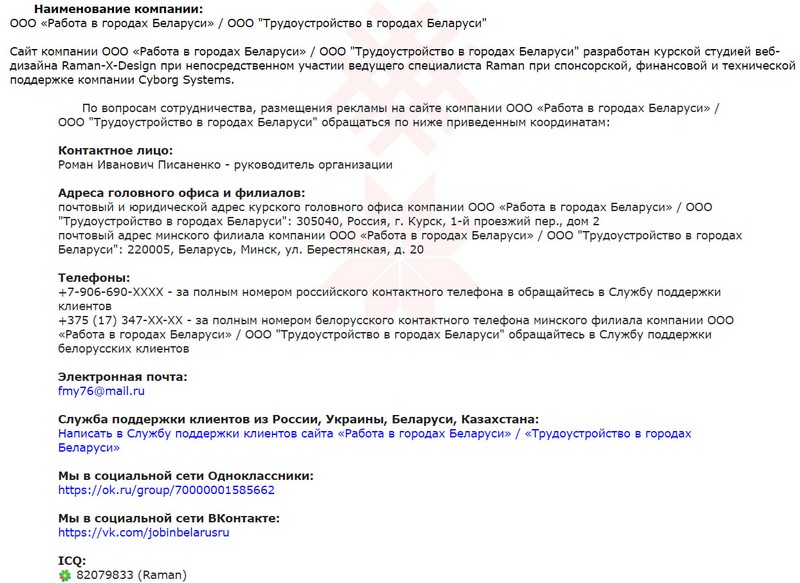 Самое интересное на этом сайте — раздел «Контакты». Сайт создала якобы компания «ООО «Работа в городах Беларуси» / ООО «Трудоустройство в городах Беларуси»». На самом деле ее не существует, данных о ней нет ни в «Едином государственном реестре юридических лиц и индивидуальных предпринимателей» Беларуси и России, ни на других сайтах проверки компаний и контрагентов.