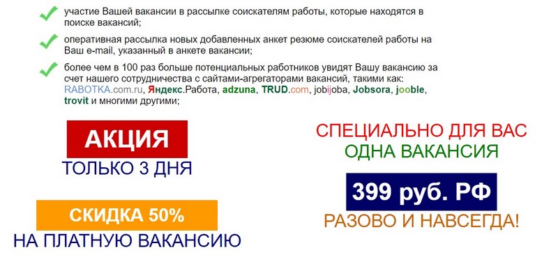 Сайт пытается заработать на размещении у себя вакансий от работодателей и резюме от соискателей. Конечно, их якобы можно разместить бесплатно, но нужно ждать 30 дней, чтобы объявление опубликовали. Сайт предлагает решение для ускорения процесса — разместить платно. И просит за публикацию одной вакансии 399 российских рублей (примерно 14 беларуских рублей).