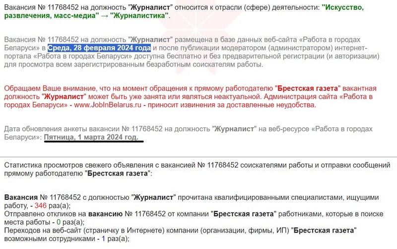 Кроме того, сайт публикует несуществующие вакансии. Например, мы нашли несколько вакансий от «Брестской газеты». Якобы издание ищет журналистов, специалистов отдела рекламы, спортивных корреспондентов. Одна из вакансий «журналиста» размещена на сайте во вторник, 27 февраля. А уже 1 марта было написано, что 28 февраля, то есть ее сдвинули на один день. Вакансию якобы просмотрели 344 раза. Также на сайте разместили логотип «Брестской газеты».
