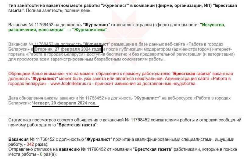 Поскольку «Брестская газета» не размещала этих вакансий ни на каких сайтах, то очевидно, что создатель сайта jobinbelarus.ru откуда-то скачал старую базу вакансий в Беларуси и разместил ее у себя.