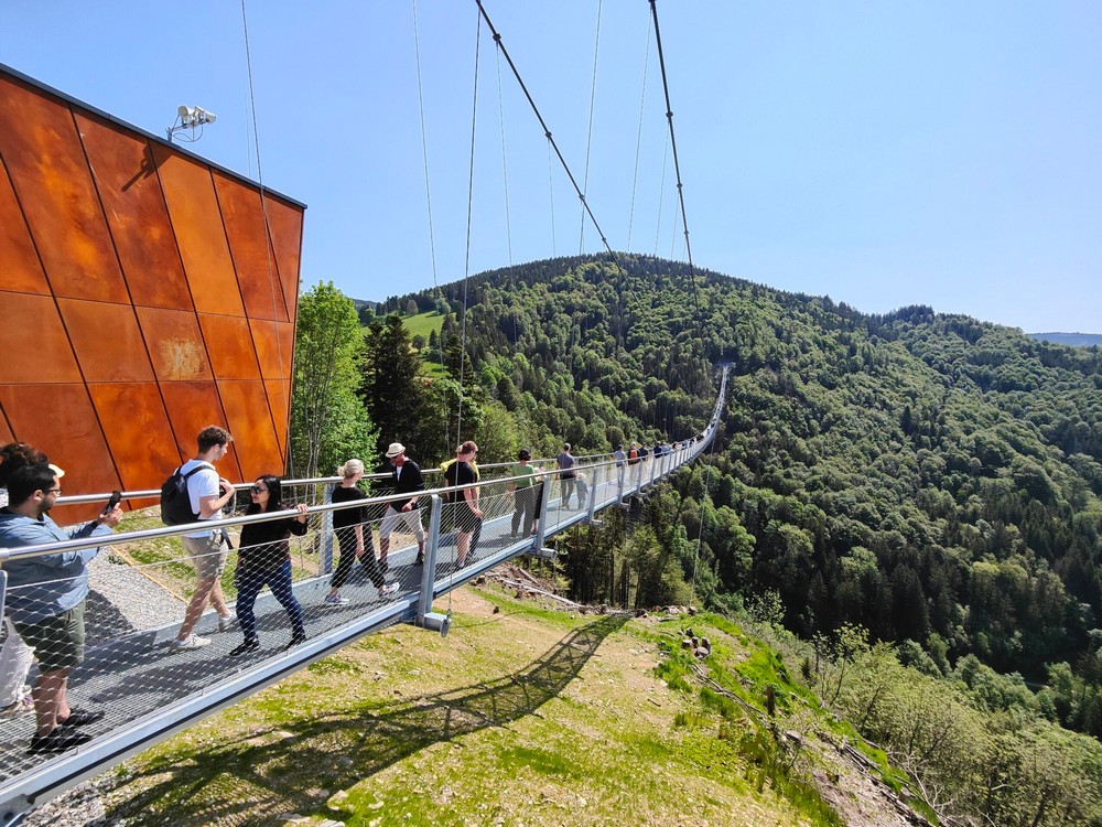 В начале июля на немецком горнолыжном курорте Виллинген, который расположен на севере земли Гессен (ее крупнейший город — Франкфурт-на-Майне), открылся один из самых длинных подвесных пешеходных мостов в мире. Его протяженность составляет 664 метра. Владельцы уверяют, что это самый длинный свободно висящий канатный мост в мире.
