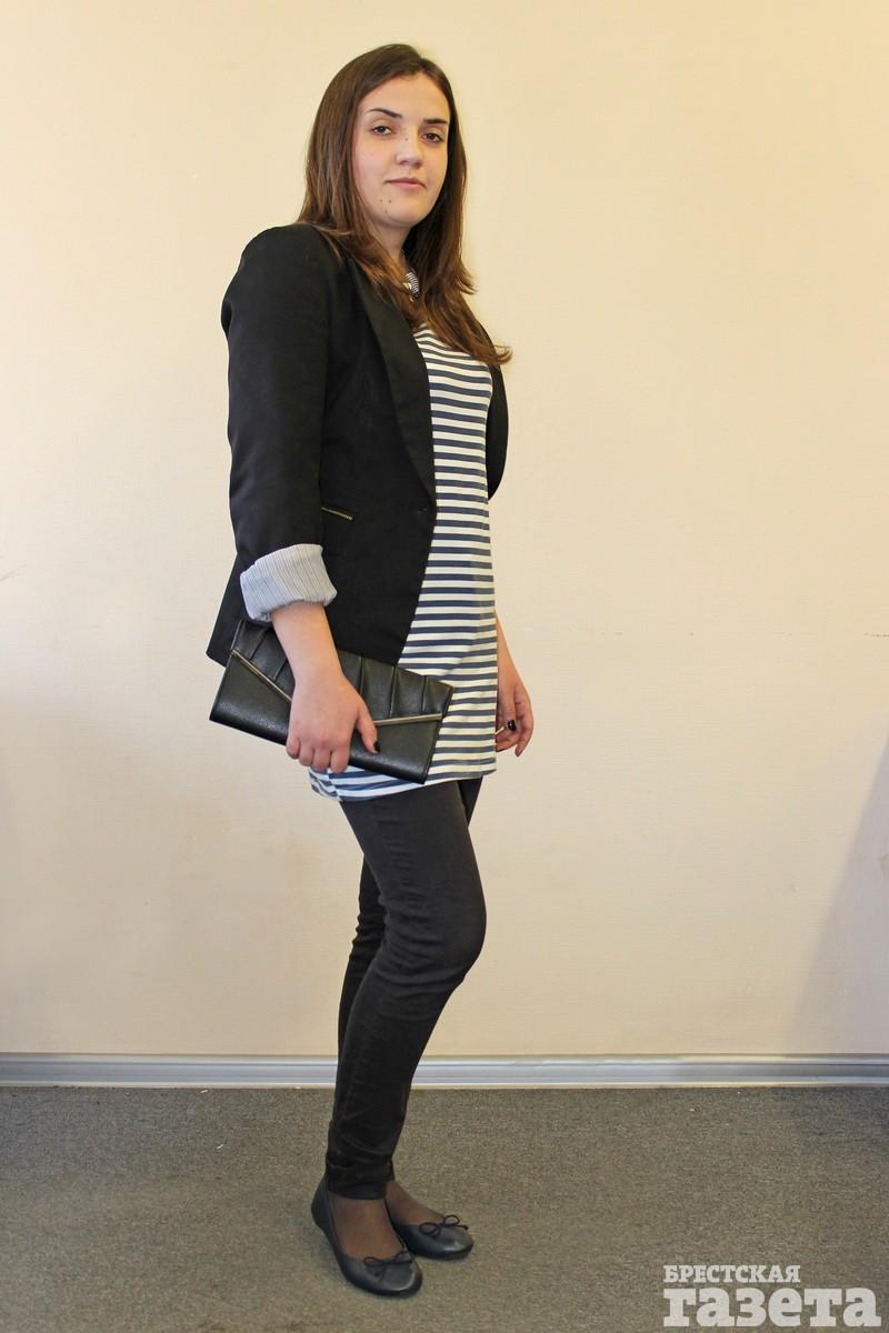 Переходим к юбкам и платьям. В данном случае главное — длина: юбка может максимально приоткрывать 5 сантиметров выше колена. В гардеробе Ирины находим ультракороткое платье в актуальную полоску. Решаем не выбрасывать его, но сочетать с джинсами и короткой курткой.