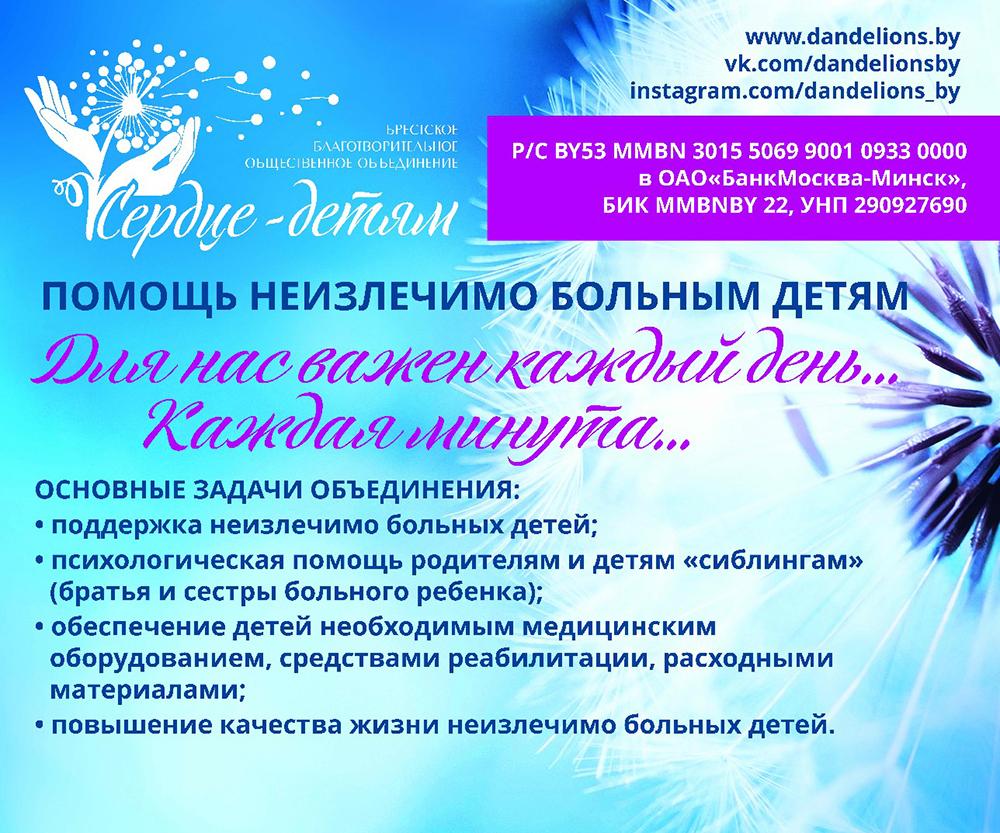 Помочь Насте можно, перечислив деньги на расчетный счет Брестского благотворительного общественного объединения «Сердце — детям» BY53MMBN30155069900109330000 в ОАО «Банк Москва-Минск», БИК MMBNBY22, УНП 290927690