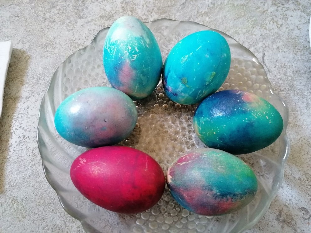 Популярны сегодня цветные «мраморные» яйца. Большинство тех, кто уже испробовал мраморный способ окрашивания яиц утверждают, что это один из наиболее простых вариантов, чтобы быстро и в домашних условиях наделить обычное яйцо вау-эффектом. Не забудьте заранее подготовить рабочее пространство. Застелите кухонный стол газетой или салфетками. Запаситесь несколькими баночками с широким горлышком. Не забудьте убедиться, что на вашей кухне имеется растительное масло.
