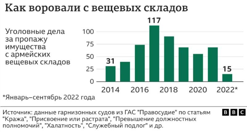 Эти два приговора — лишь последние примеры того, как российские военнослужащие годами воровали обмундирование, обувь и другие вещи у собственной армии. За последние восемь лет (эту цифру российская пропаганда использовала в сакральной фразе «Где вы были восемь лет?») гарнизонные военные суды вынесли не менее 558 приговоров за пропажу имущества с вещевых складов, подсчитала Би-би-си на основе данных ГАС «Правосудие».