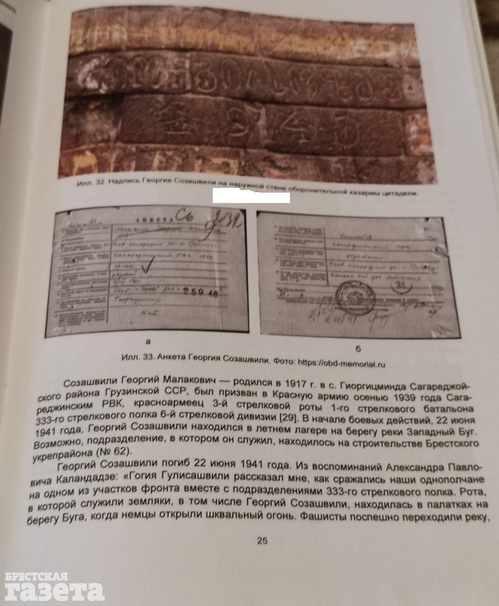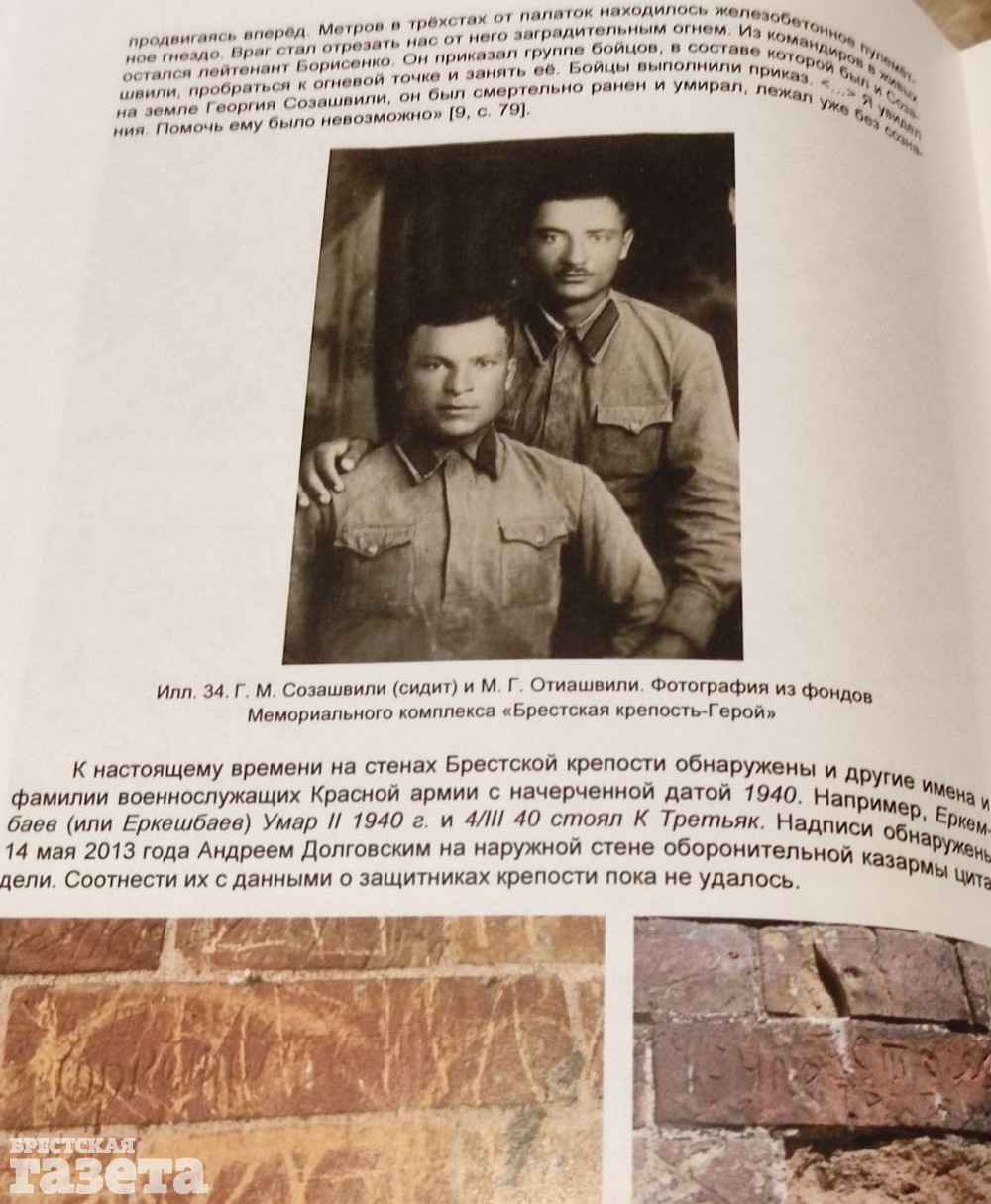 «Брестская газета» пообщалась с независимыми краеведами и открыла книгу «Надписи и рисунки на стенах Брестской крепости», в которой подробно рассказывается в том числе про «недавно найденную» надпись «Георгий Созашвили, 1940».