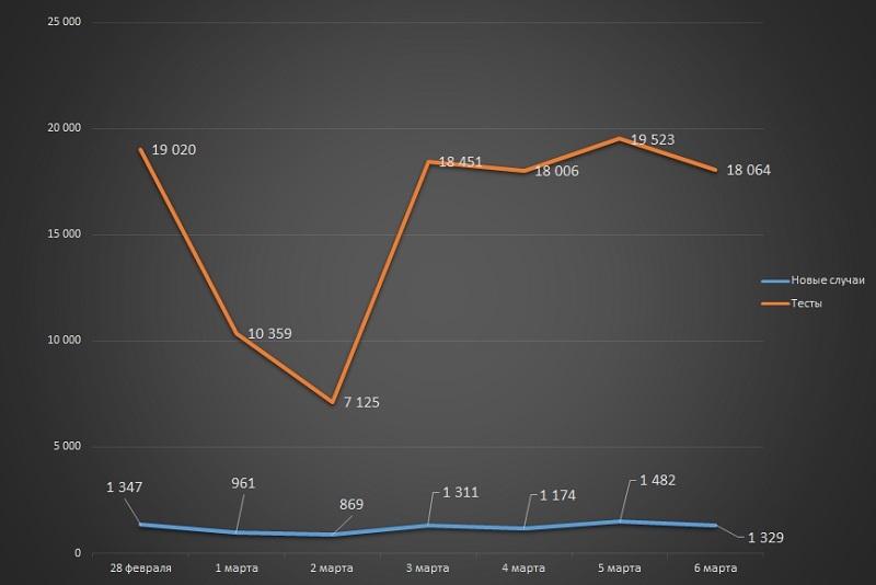 Наибольшее число зараженных вторую неделю подряд было выявлено в пятницу – 1 482 случая. Наименьшее – во вторник (869). В среднем в течение февраля ежедневный прирост составил 1 641 случай, с 28 февраля по 6 марта – 1 210. Неделей ранее этот показатель равнялся 1 281 новому случаю заражения COVID-19.