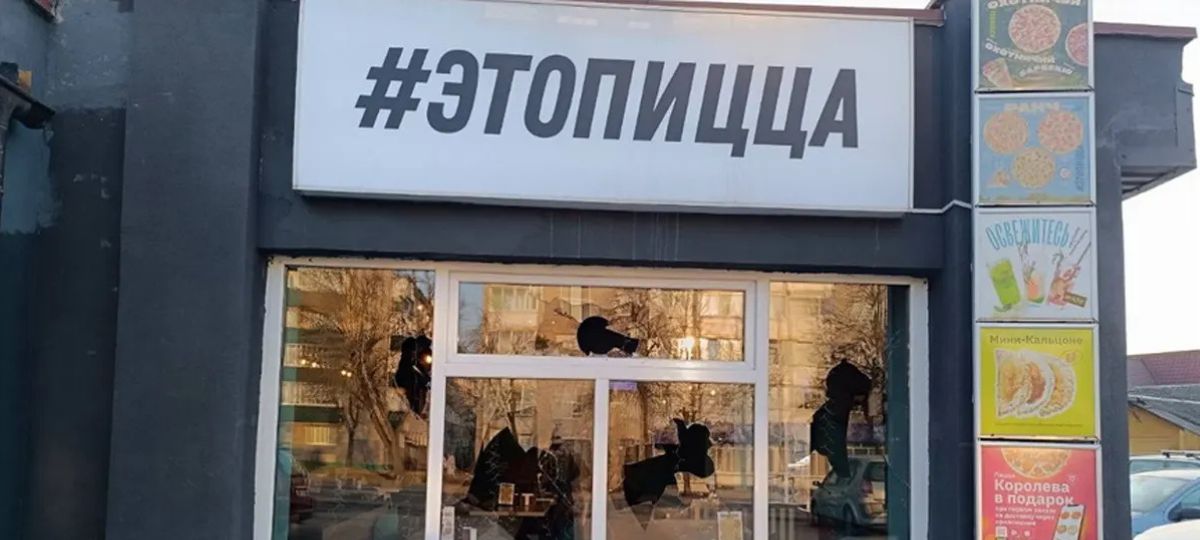 Инцидент произошел на улице Кирова в Барановичах. По словам очевидцев, прохожий внезапно достал неизвестный предмет (по словам очевидцев — топор) и начал бить им по окнам здания, где располагается пиццерия «Этопицца». Удары следовали один за другим — мужчина действовал хаотично и явно не обращал внимания на людей вокруг.
