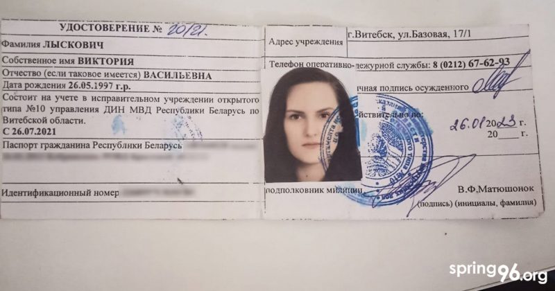 В конце июля им позвонил участковый Ленинского РОВД и сказал, что нужно прийти и получить направление на «химию». Викторию направили в витебское ИУОТ №10, а Елену — в гродненское ИУОТ №25. Как показывает практика, политзаключенных специально отправляют подальше от дома.