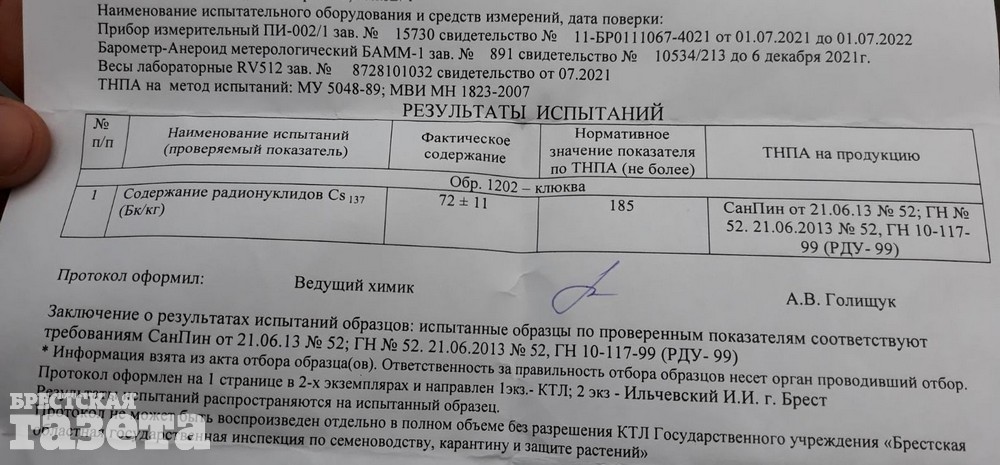 Допустимая концентрация радионуклидов, безопасная для организма, – 185 Бк/кг. Ситуация по этому году на брестском рынке обнадеживающая. Как рассказали сотрудники лаборатории ветеринарно-санитарной экспертизы, в нынешнем сезоне ни в одном из образцов не выявлено превышения по цезию-137. Хотя на рынке «Юбилейный» такое случалось.