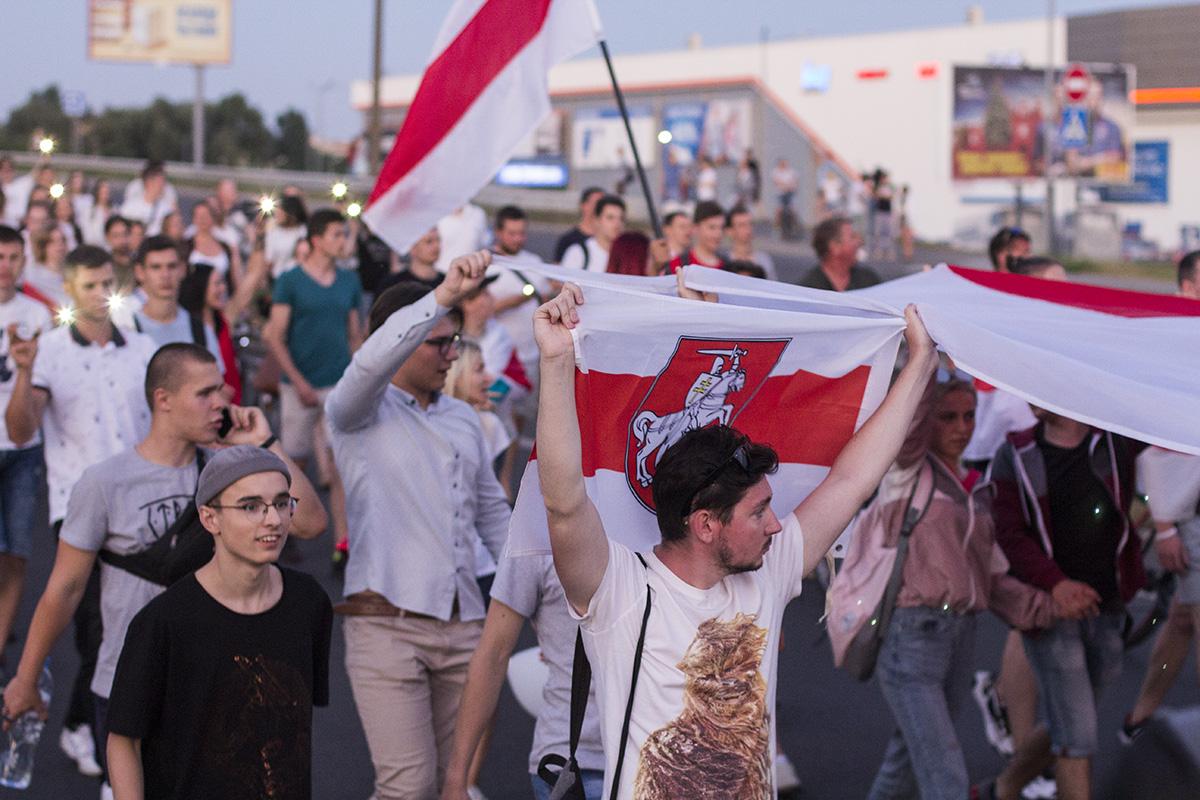 Люди, которые собрались перед заграждениями скандировали «Жыве Беларусь», «Верым, можам, пераможам». По другую сторону ограждения, помимо милиции, стояла малочисленная группа протестующих. Среди них — лидер группы «Дай Дарогу!» Юрий Стыльский, который вел стрим с места событий. Они пришли на площадь Ленина заранее, когда милиция еще не выставила турникеты, и расправили напротив облисполкома большой бело-красно-белый флаг.