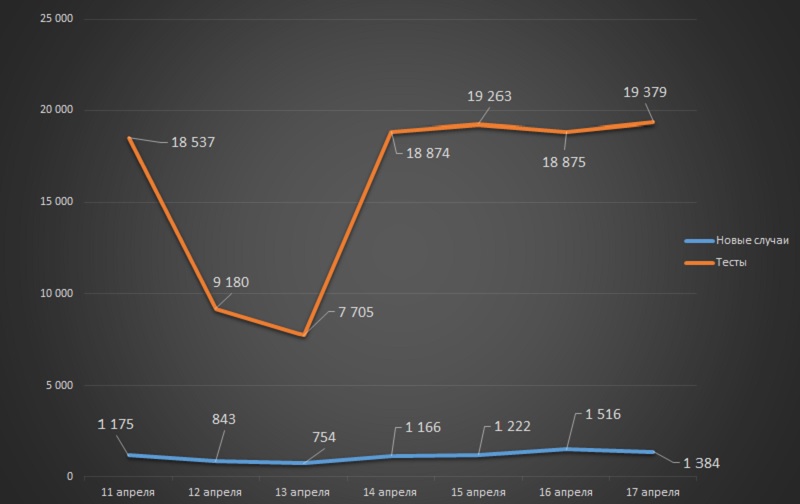 Что касается количества выполненных тестов, то за период с 11 по 17 апреля их было 111 813 (на предыдущей неделе – 110 556), а официальная смертность поднялась на 1: неделей ранее было зафиксировано 68 летальных исходов, за последние исследуемые семь дней – 69.