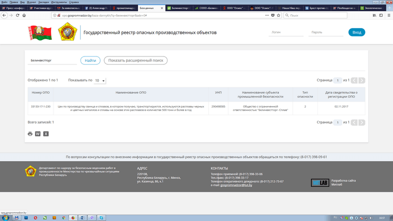В государственном реестре опасных производственных объектов госпромнадзора 2 ноября 2017 года было зарегистрировано ООО «БИТ-Сплав». Как записано: цех по производству свинца и сплавов, в котором получаются, транспортируются, используются расплавы черных и цветных металлов и сплавы на основе этих расплавов в количестве 500 тонн и более в год. Еще раз повторю: 2 ноября 2017 года. Что это предприятие делало до того? Завод, который строится под Брестом, должен был обязательно попасть в этот реестр. (Елена Макаревич)