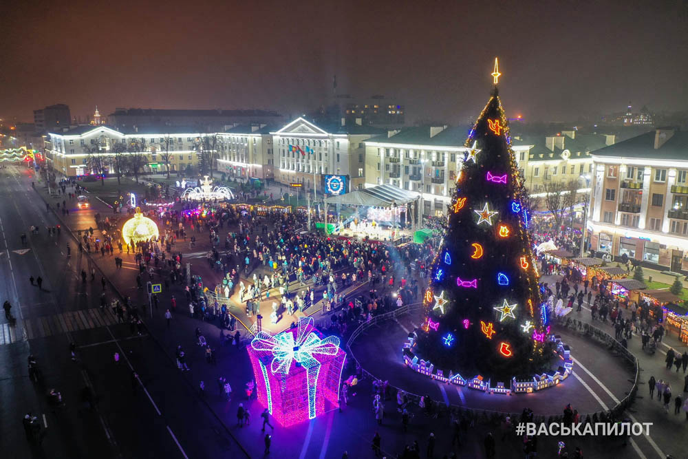 Итак, 2020 год. Год никак не располагающий к празднику. Мягко говоря. В стране репрессии, политзаключенные и полная неизвестность. Тем не менее, елку на площади поставили, представление устроили. Мы сделали фоторепортаж этого события. Выводы делайте сами. Что касается елки, то она была похожа на версию 2013 – 2014 годов. Единственное, что порадовало глаз — светящиеся домики вокруг зимней красавицы.