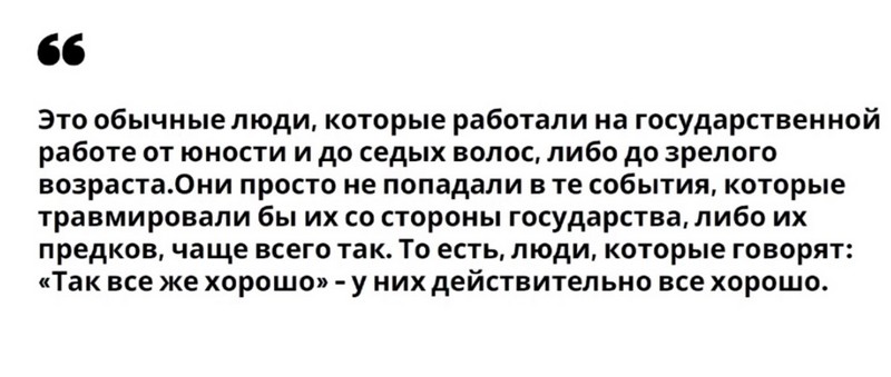 По словам Марины Новиковой, у таких людей никогда не было травм со стороны государства, они никогда не сталкивались с проблемами со стороны государства. Такое бывает. В пример приводят следующую цитату респондента: