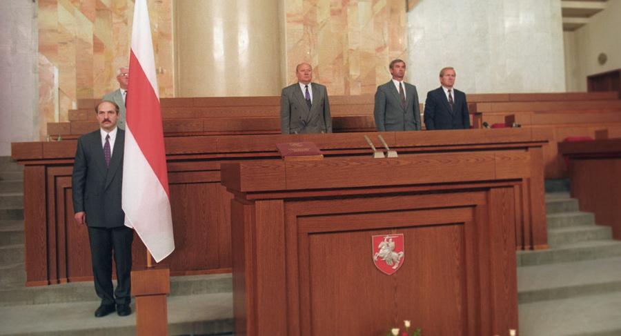 После распада СССР бело-красно-белое знамя было утверждено в 1991 году в качестве государственного флага новообразованного белорусского государства. Таким образом первым государственным флагом независимой Беларуси стал БЧБ флаг. Именно под ним принимал свою первую президентскую присягу Александр Лукашенко, и тогда никто не говорил, что это фашистский флаг.