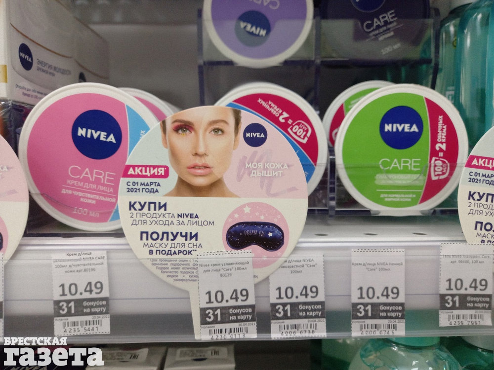 На полках некоторых брестских магазинов, где стоят шампуни, крема и другая уходовая косметика, продукцию вышеуказанной марки не удалось найти уже сегодня в первой половине дня. Нет, их не раскупили, а просто решили снять с полок на день раньше. А в других торговых точках, причем, в ассортименте, по «старой» цене и без скидок Nivea имелась.