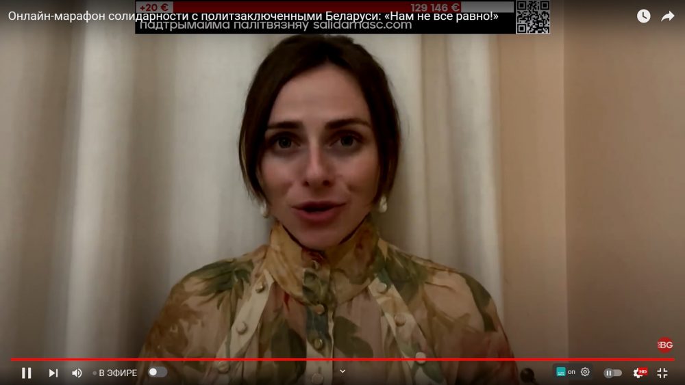 Дальше в эфире показали видеообращение оперной певицы Маргариты Левчук. Она попросила присоединяться к онлайн-марафону солидарности с политзаключенными и помогать им.