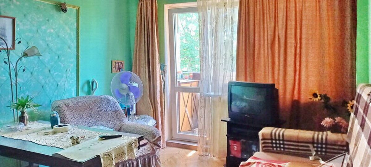 В описании первым делом указано, что по техпаспорту квартира 1-комнатная, но фактически 2-комнатная. Вторая комната находится в пристройке. Общая площадь — 50,2 кв. м, площадь кухни — 10,2 кв. м. Квартира расположена на первом этаже двухэтажного кирпичного дома 1955 года постройки. Санузел совмещенный, полы дощатые, окна ПВХ, в пристройке деревянные.