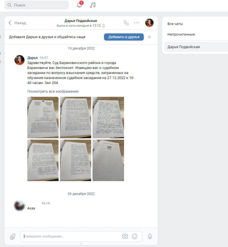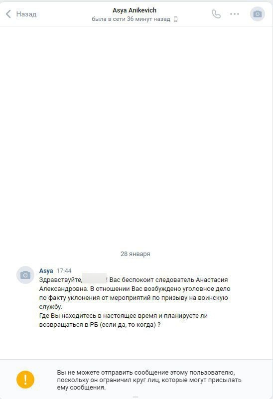 28 января 2023 года во «ВКонтакте» Виктор получил сообщение от пользователя с именем Ася Аникевич, профиль у нее закрыт. Девушка представилась следователем Анастасией Александровной и сообщила ему про уголовное дело «по факту уклонений от мероприятий по призыву на воинскую службу».