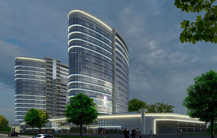 Этот проект существует пока только в качестве рендеров застройщика “Жилстройкомплект”. Никакой информации об общественных обсуждениях мы не нашли. По проекту на участке за перекрестком с улицей Махновича, между строящимся бизнес-центром и заправкой “Славнефть” могут появиться 17-этажные высотки.