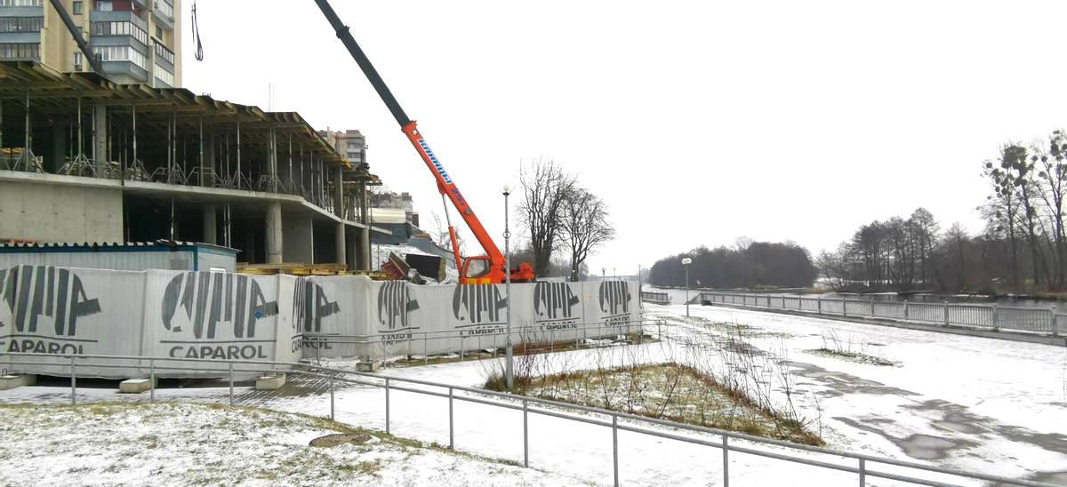 Теперь отчетливо видно: дом буквально прижат к прогулочной дорожке набережной. Проектировщики – компания БрестКАДпроект – попытались примирить брестчан с этим объектом: в цокольном этаже здания отведено место для кофейни и пункта проката спортинвентаря.