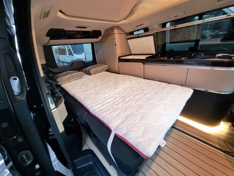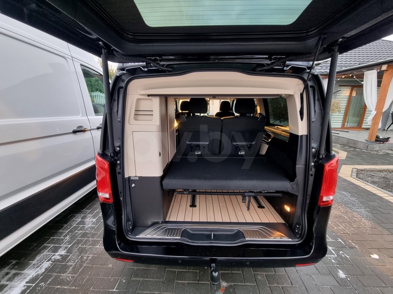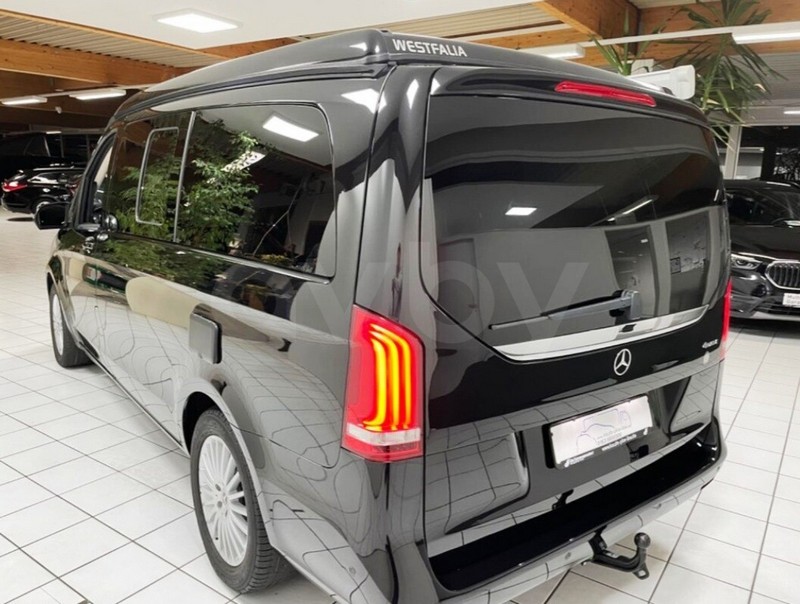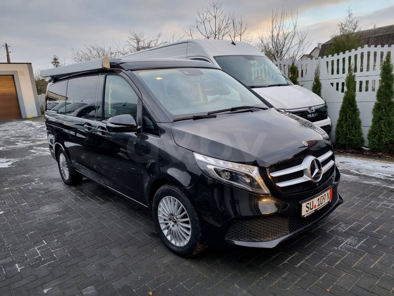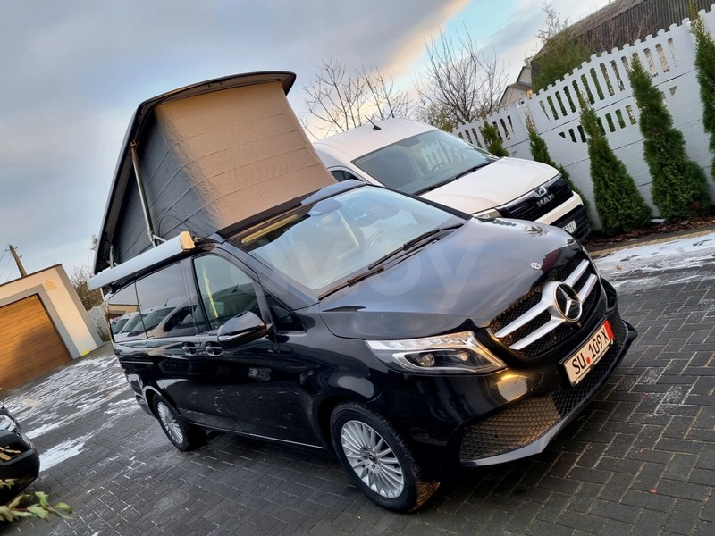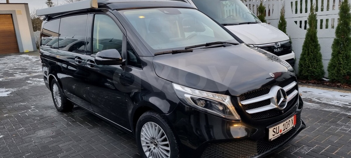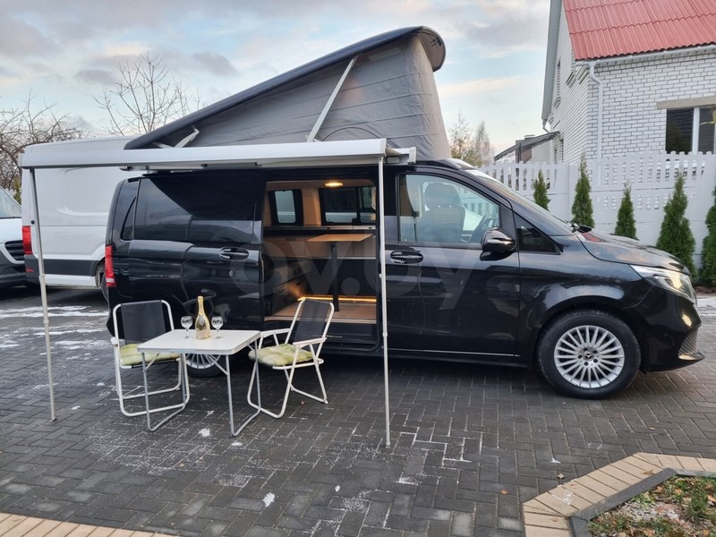 Черный микроавтобус марки Mercedes-Benz предлагается любителям путешествовать большой компанией. Автомобиль 2020 года выпуска на автомате, 2.0 л, дизель, постоянный полный привод, пробег — уже 80 000 км. Marco Polo V300D 4Matic c подъемной крышей Westfalia.