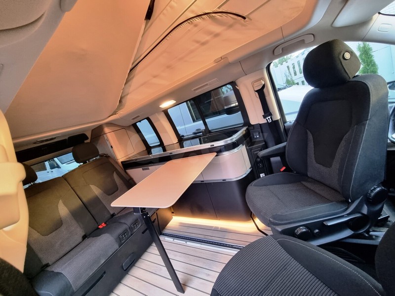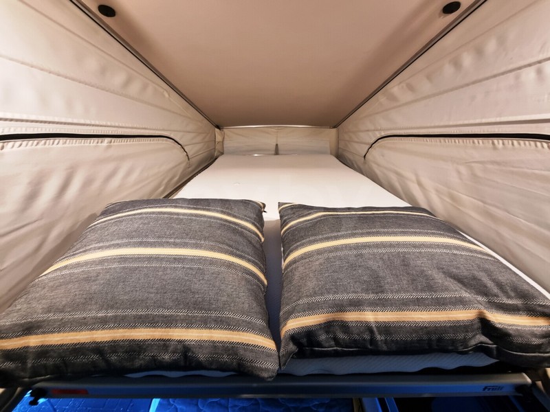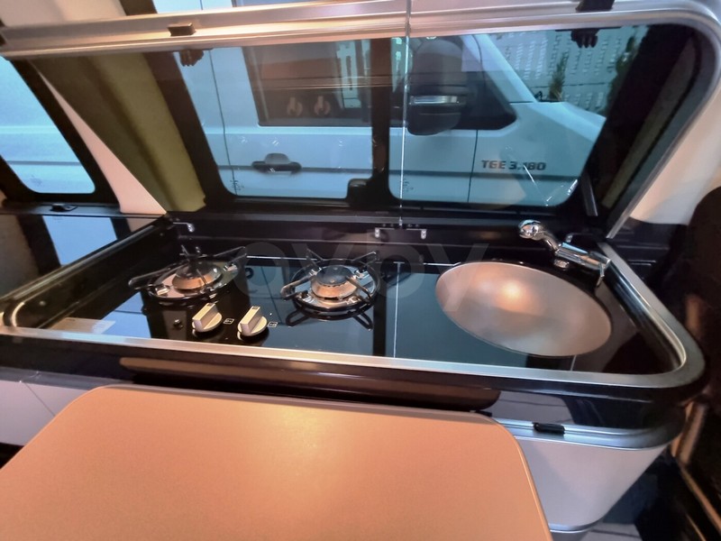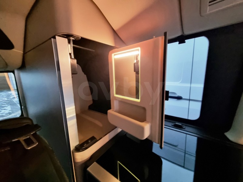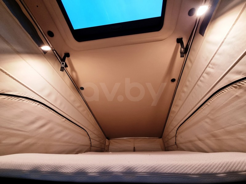 В компактном доме на колесах поместилось практически все для комфортного путешествия. Четыре посадочных места, столько же спальных, отдельная спальня на втором этаже. Имеется кухонная плита с двумя конфорками на газу, холодильник, бак для чистой воды. Также есть большое количество вещевых ящиков для одежды, обуви и личных вещей.