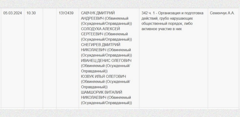 Сегодня в суде Ленинского района Бреста началось рассмотрение уголовного дела сразу против шестерых брестчан. Это Алексей Сергеевич Солодуха, Виталий Николаевич Шамшорик, Денис Олегович Иванец, Дмитрий Андреевич Савчук, Дмитрий Николаевич Снегирев и Илья Олегович Юзвук.