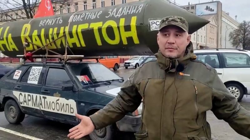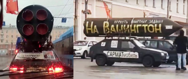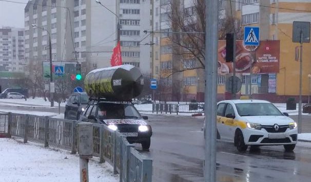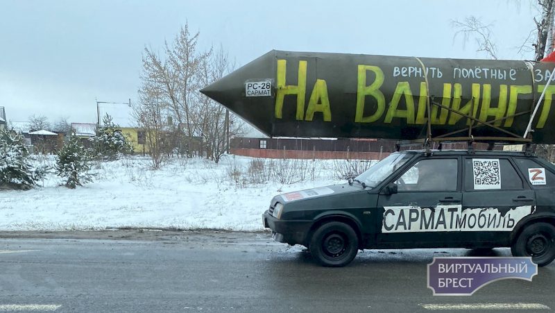 Первым «сармат-мобиль» обнаружило гомельское издание «Флагшток». На машине большие наклейки Z, на крыше — макет ракеты с надписью «Вернуть полетные задания на Вашингтон». Издание пишет, что хозяин автомобиля — активист прокремлевской организации НОД Равиль Гарифуллин. Он из российского Татарстана. Мужчина спокойно передвигался по Гомелю, оставлял машину на площадях, но ГАИ этот автомобиль не замечает.