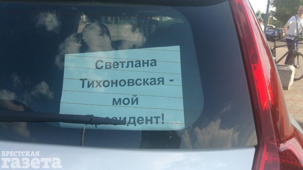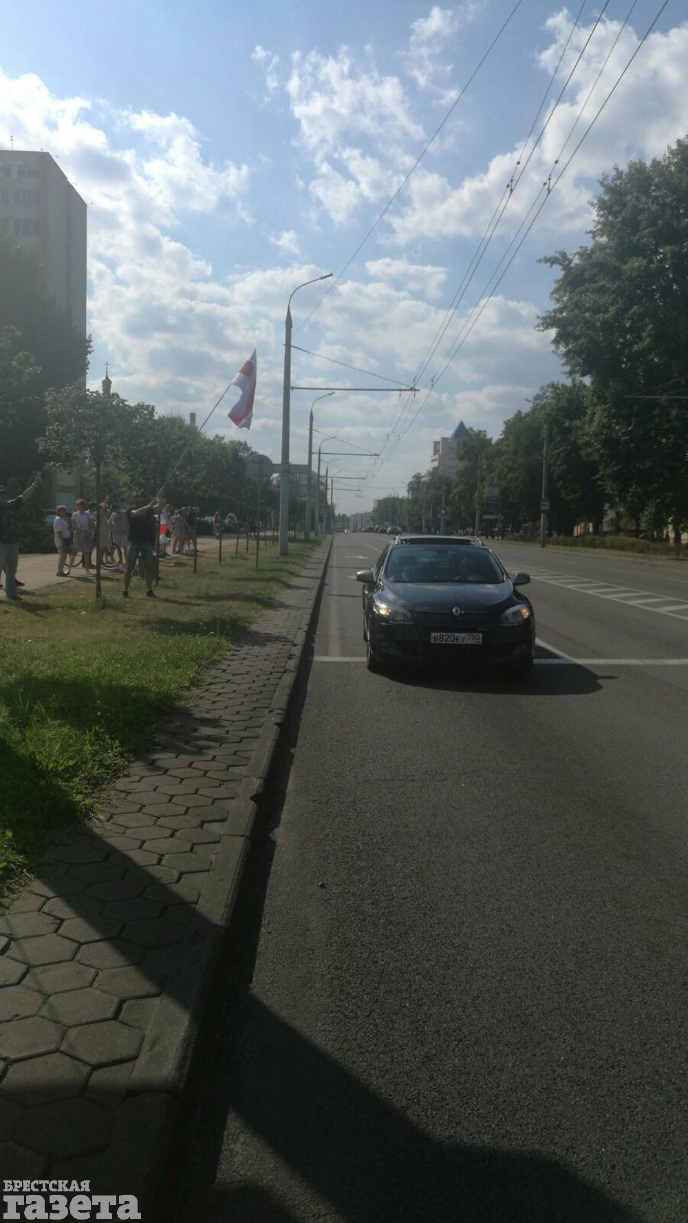 Около 16.35 сотрудники остановили автомобиль, который сигналил цепи солидарности. За его стеклом — листок, на котором напечатано «Светлана Тихановская — мой президент». По его словам, у него забрали водительские права и техпаспорт.