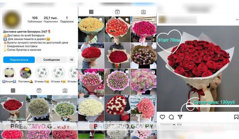 В мае 2023 года в один из Брестских РОВД обратились сразу семеро парней, которые сообщили, что их обманули при покупке цветов. Все они хотели подарить букеты своим девушкам. Для этого нашли в интернете онлайн-доставку и начали переписку с «продавцом» для обсуждения деталей заказа. Потом молодые люди внесли 100% предоплату за цветы — более 100 BYN каждый. Однако ни один букет по адресу доставлен не был.