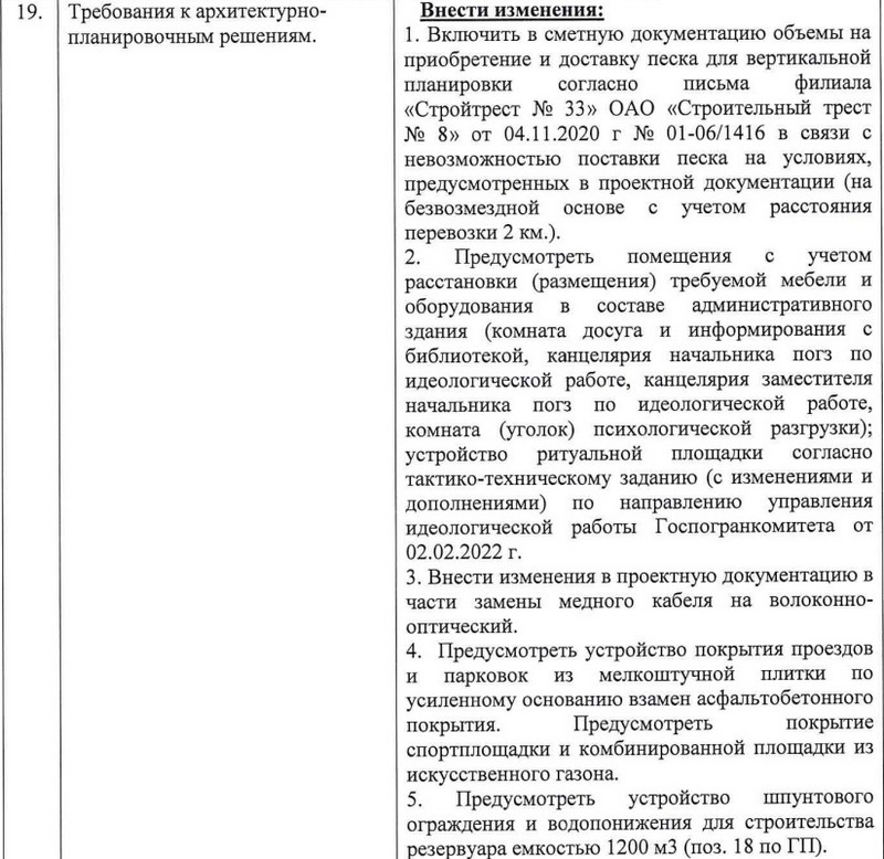 В списке было 14 пунктов на несколько страниц. Самый любопытный — пункт №2. Заказчик попросил предусмотреть помещения в административном здании для комнаты досуга и информирования с библиотекой, канцелярии начальника пограгзаставы по идеологической работе, канцелярии его зама, комнату психологической разгрузки, устройство ритуальной площадки.