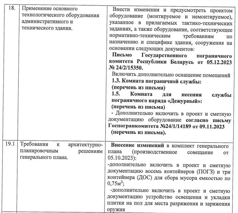 Во второй раз Брестское областное управление капитального строительства вносило изменения в строительный проект в декабре 2023 года — то есть на финише строительства комплекса погранзаставы. Изменения были косметическими, потратили на них всего 11 705,28 рублей. Из основных — оснащение комнаты для несения службы пограничного наряда «Дежурный».